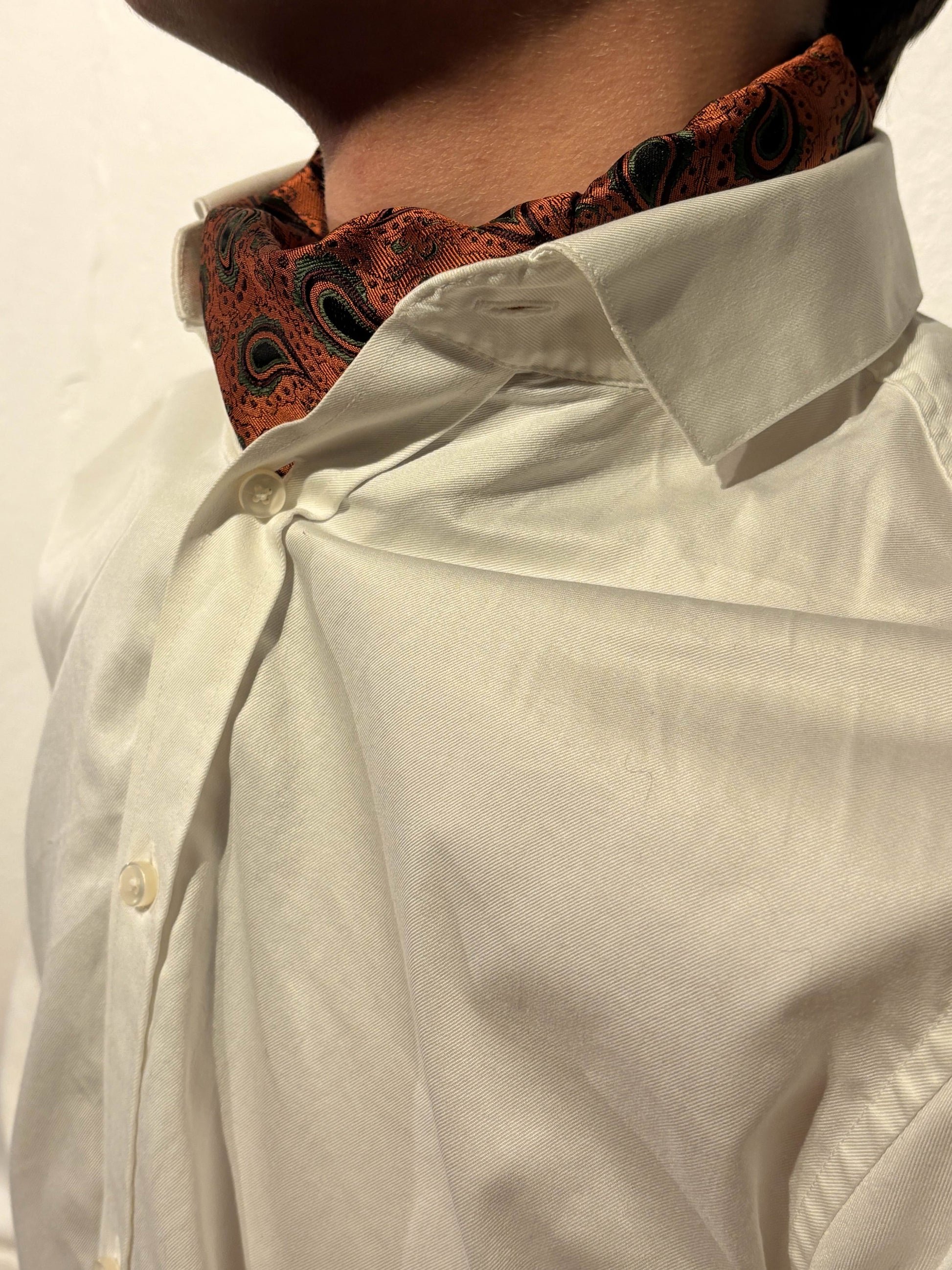En varm rustfarget ascot med dypt grønne og sorte paisleydetaljer. Fyldig, uttrykksfull og perfekt til mørke dresser – spesielt på høst og vinter.